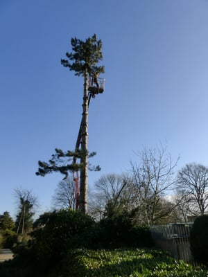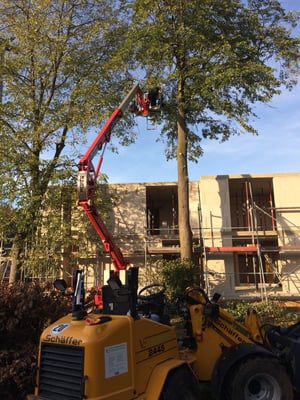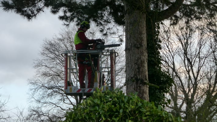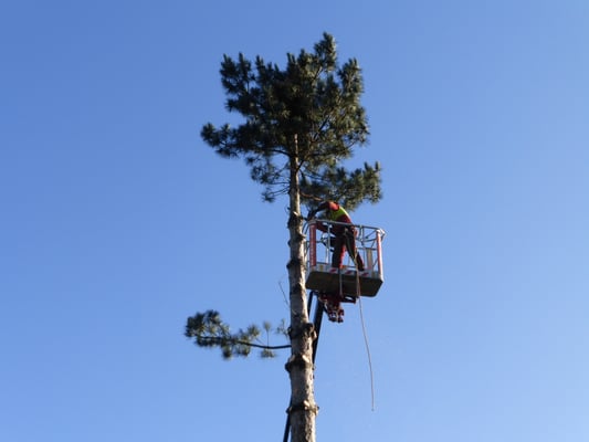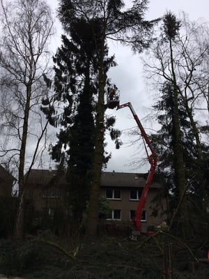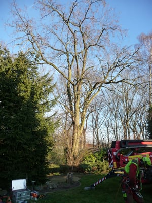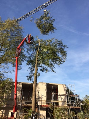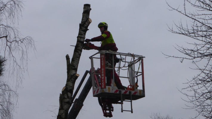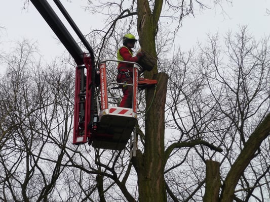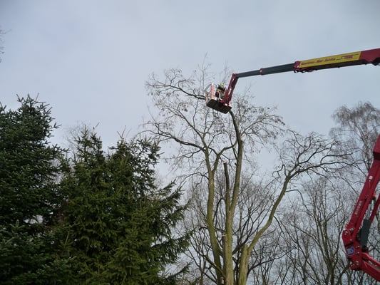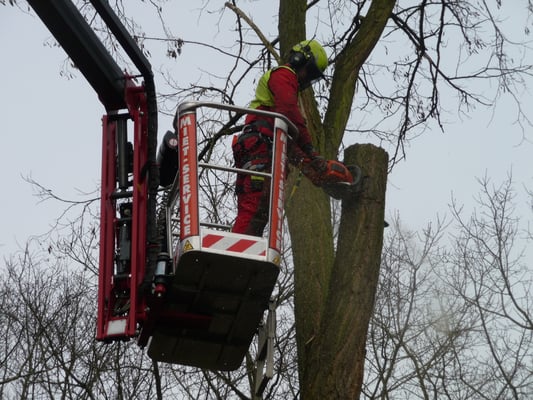 Kranke Bäume, die nicht mehr beklettert werden können, werden mithilfe von Hubarbeitsbühnen oder einem Autokran sicher zu Boden gebracht.